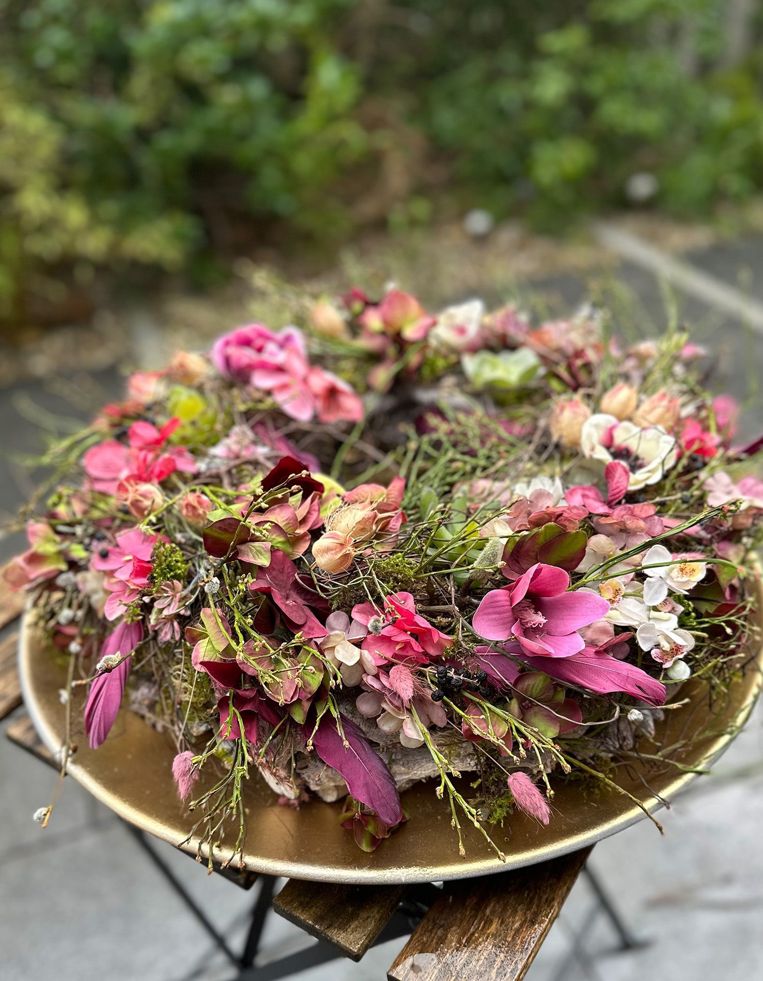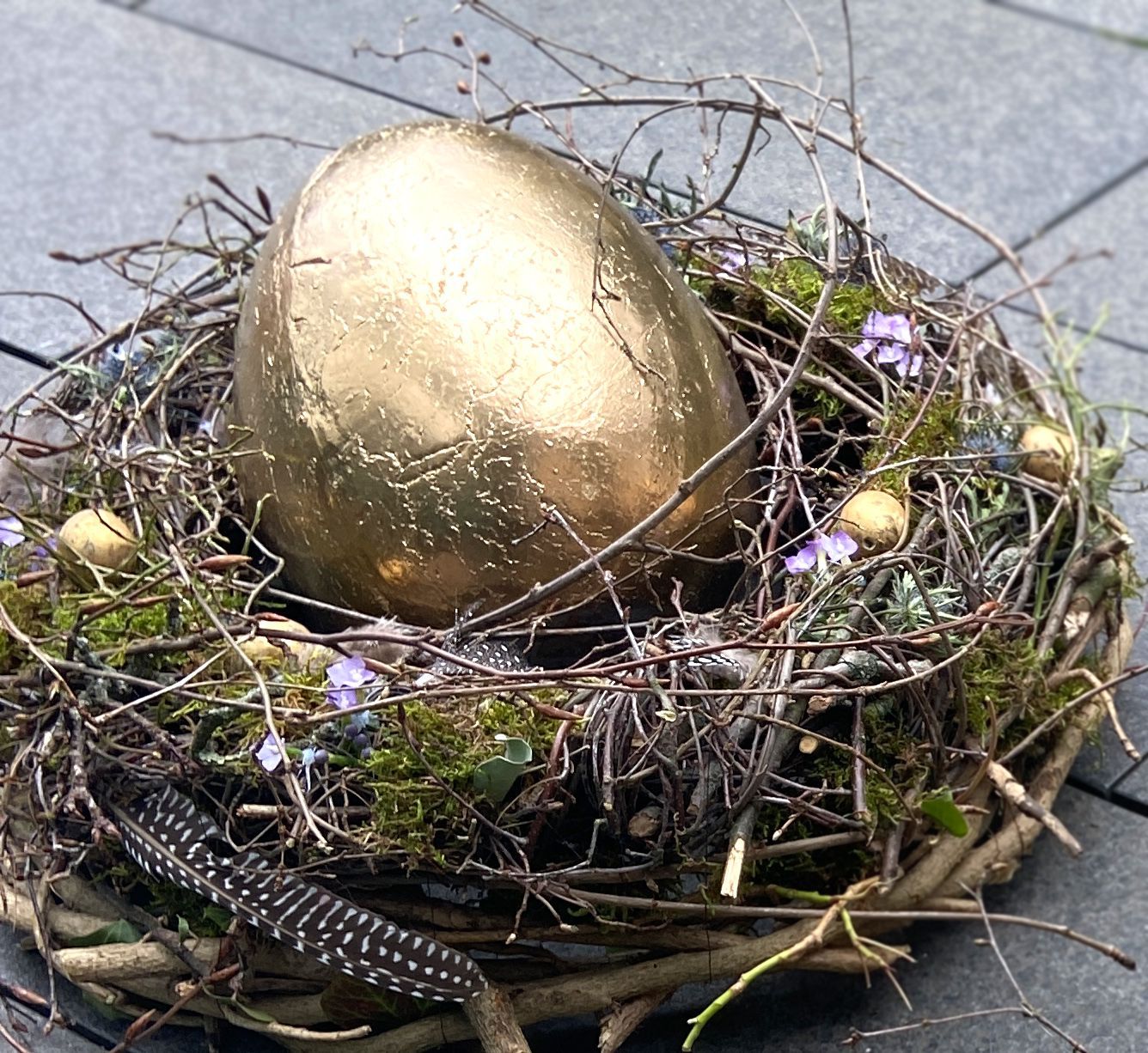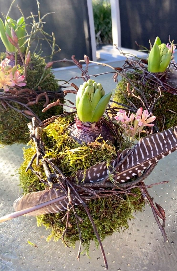 Aus Reisig, Bindegrün, Moos, Blütenzwiebeln und weiterem Naturmaterial lassen sich frühlingshafte bzw. österliche Kränze, Nester und Arrangements fertigen.