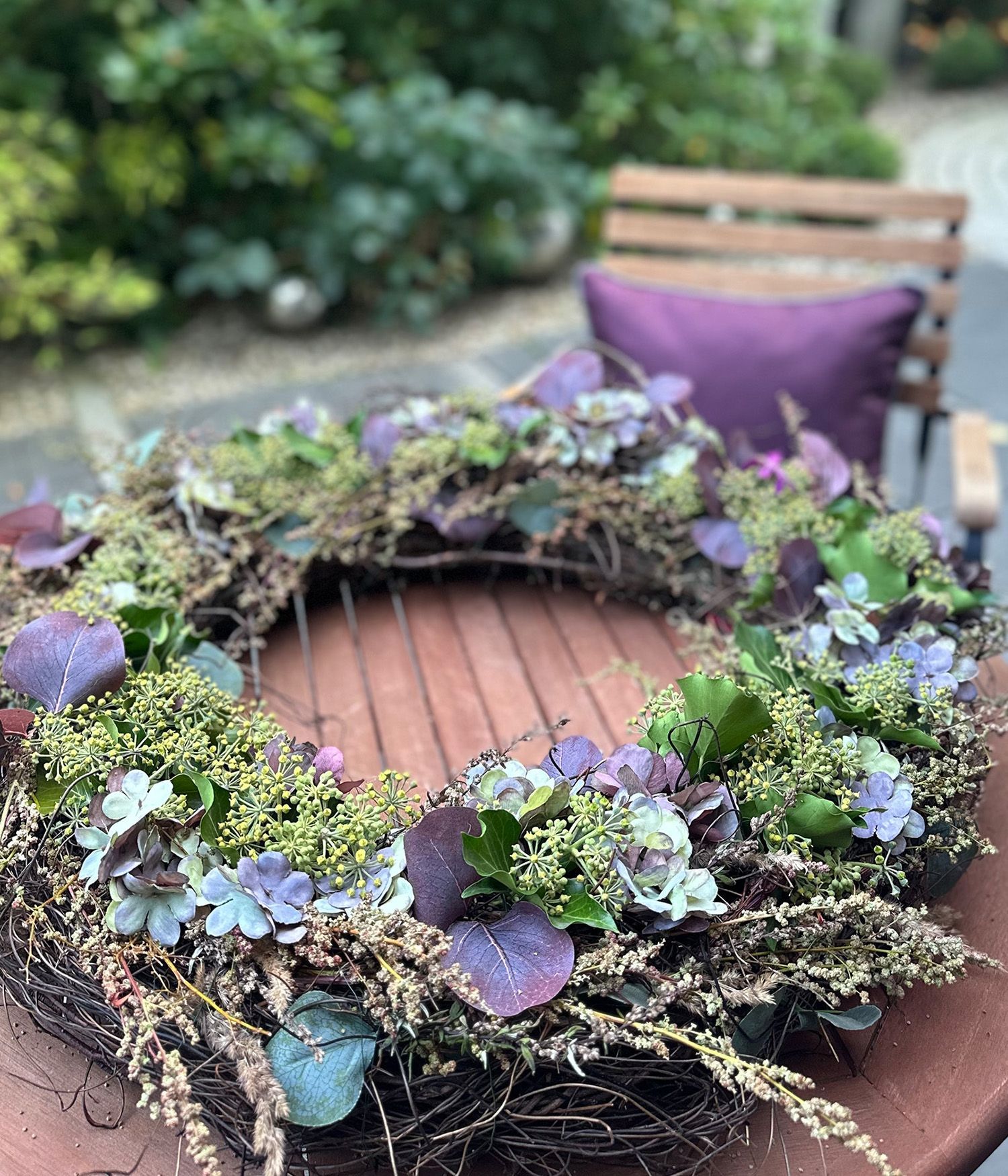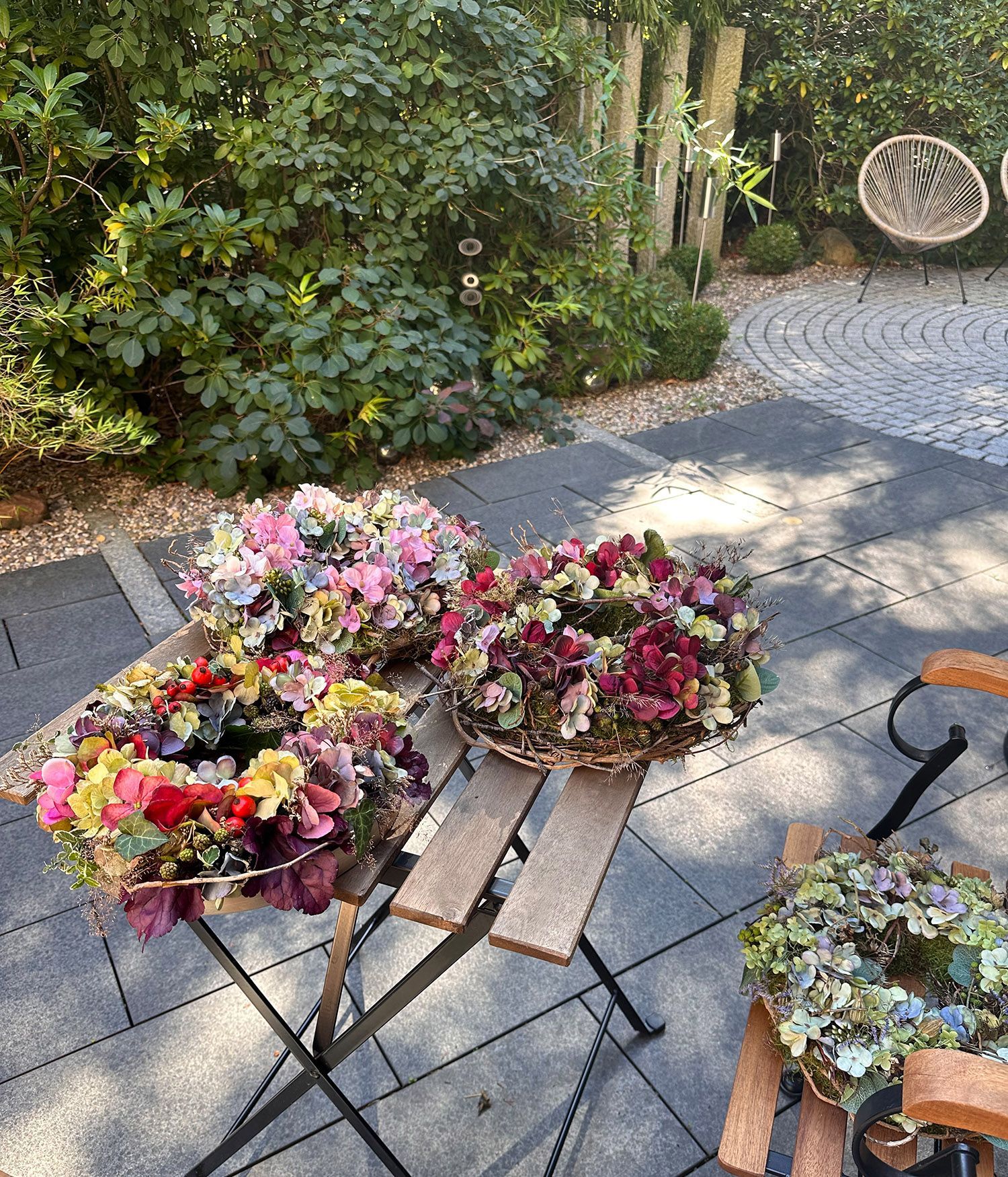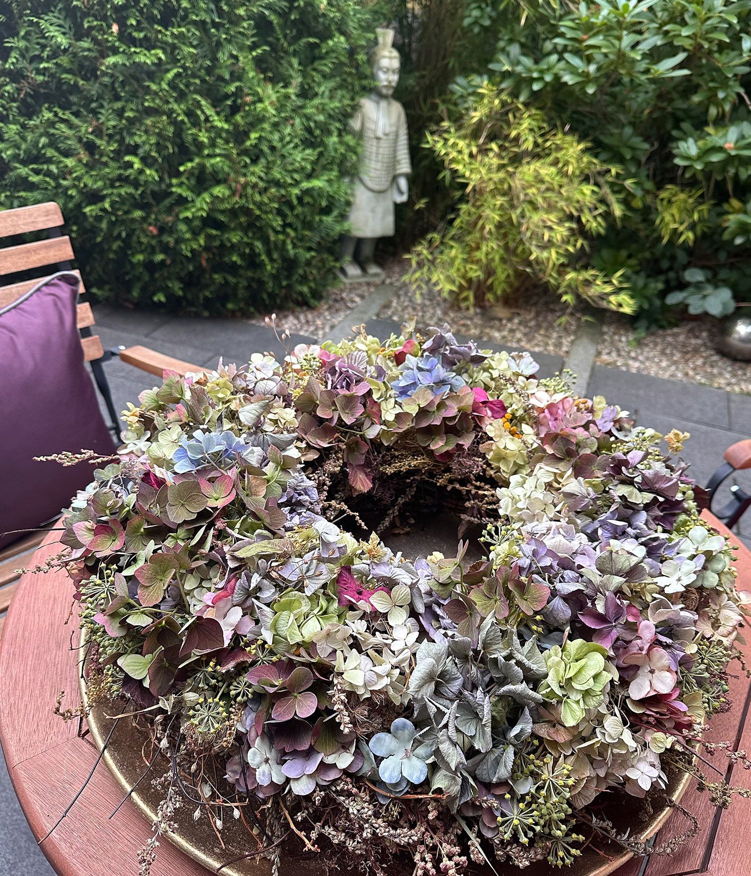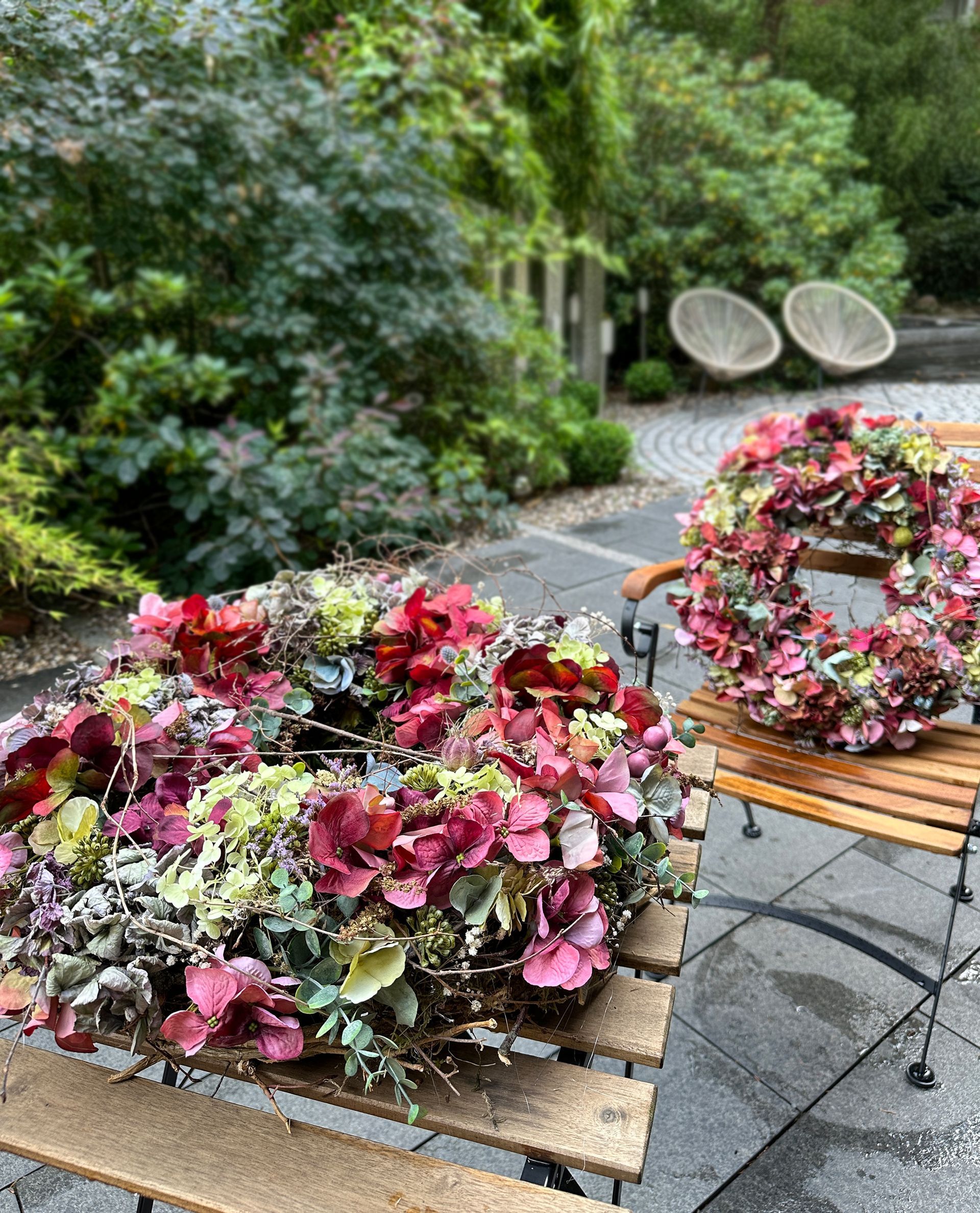 Hier werden frische Hortensien mit getrockneten Gräsern und Beeren kombiniert und mit Seidenblumen aufgefüllt, um lange Freude an den Kränzen zu haben.