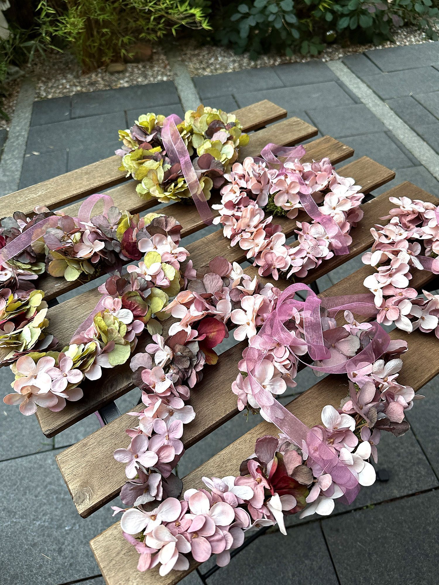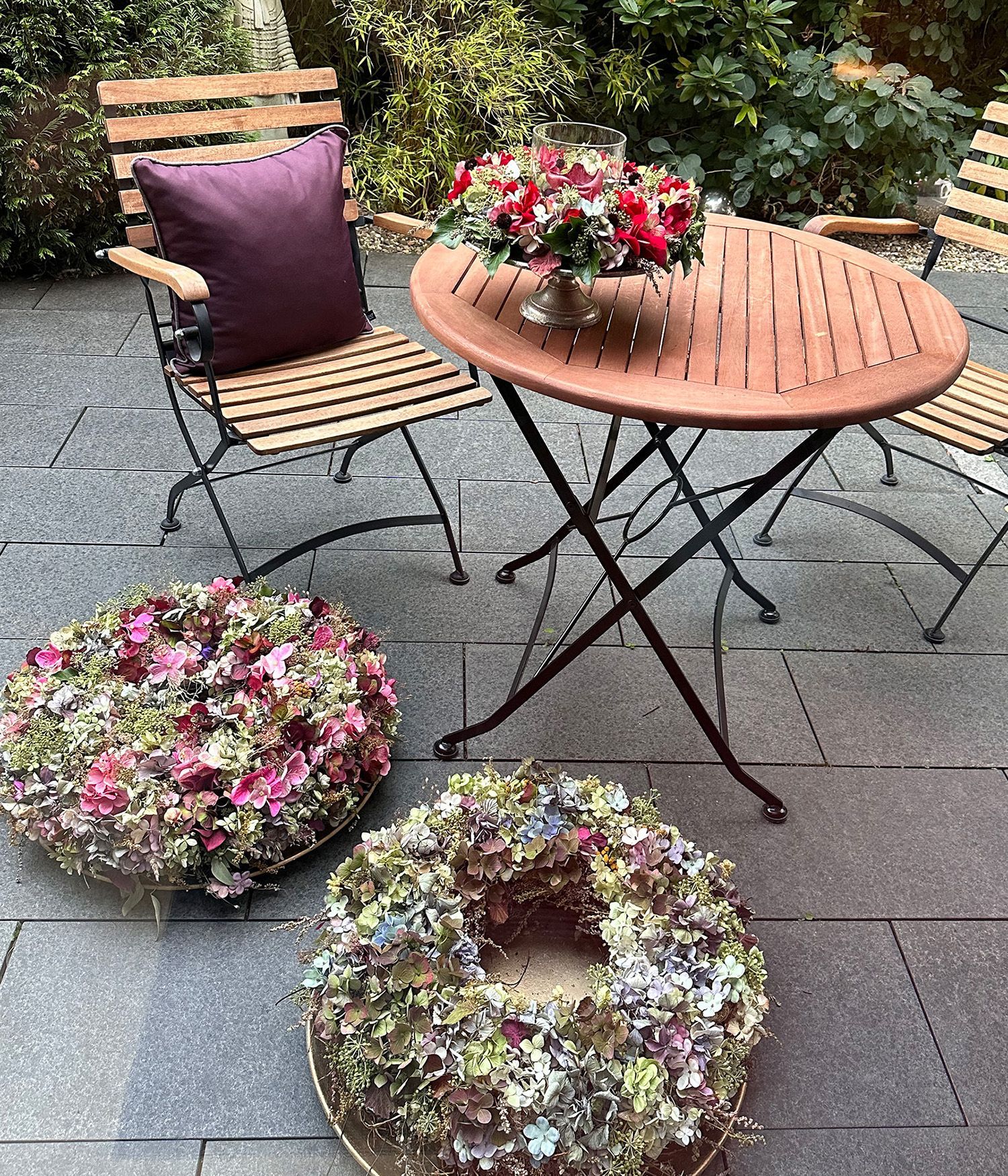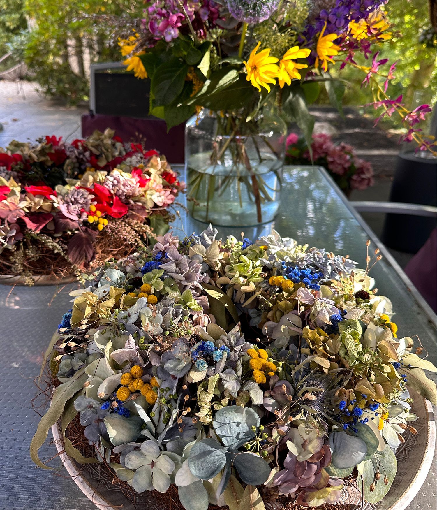 Hier werden frische Hortensien mit getrockneten Gräsern und Beeren kombiniert und mit Seidenblumen aufgefüllt, um lange Freude an den Kränzen zu haben.