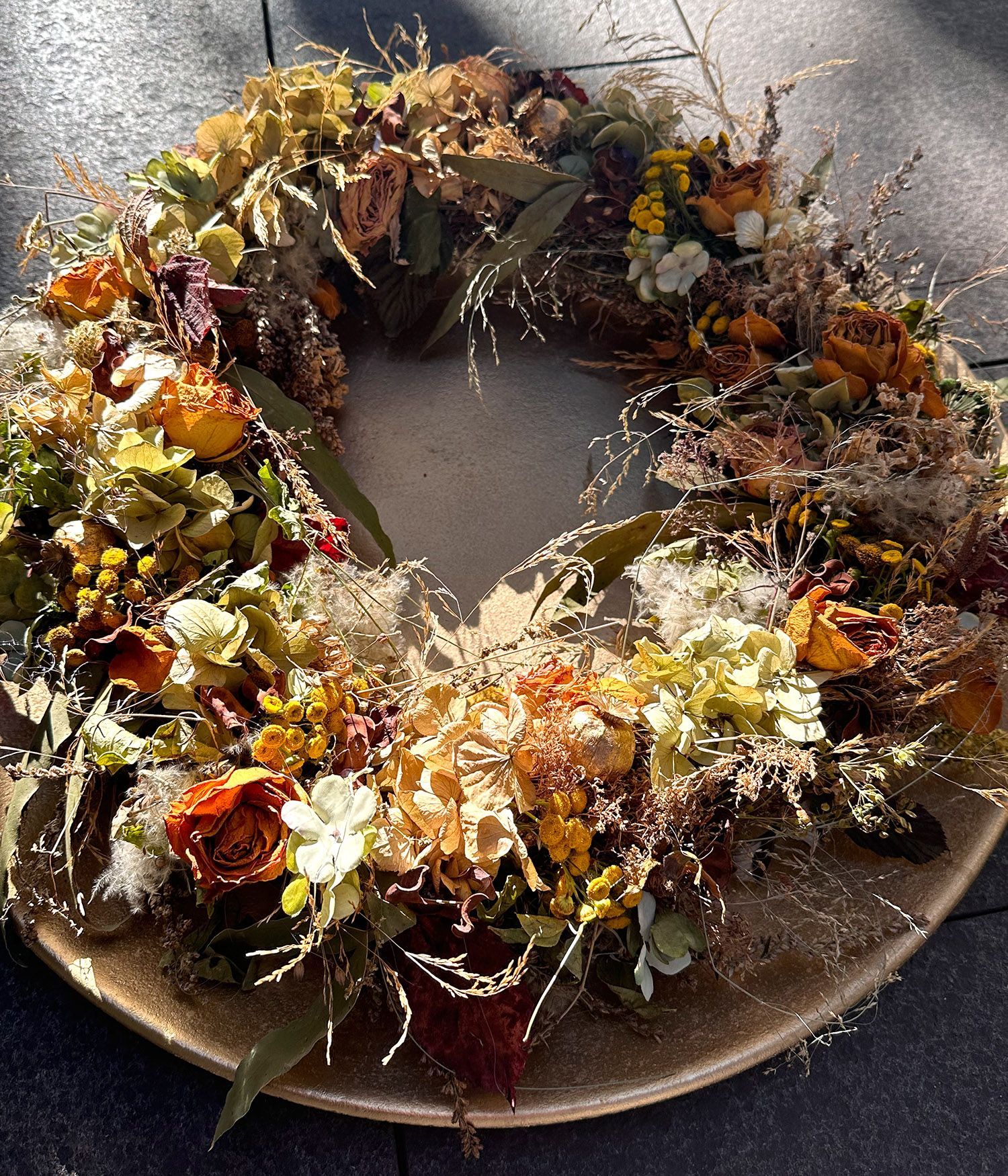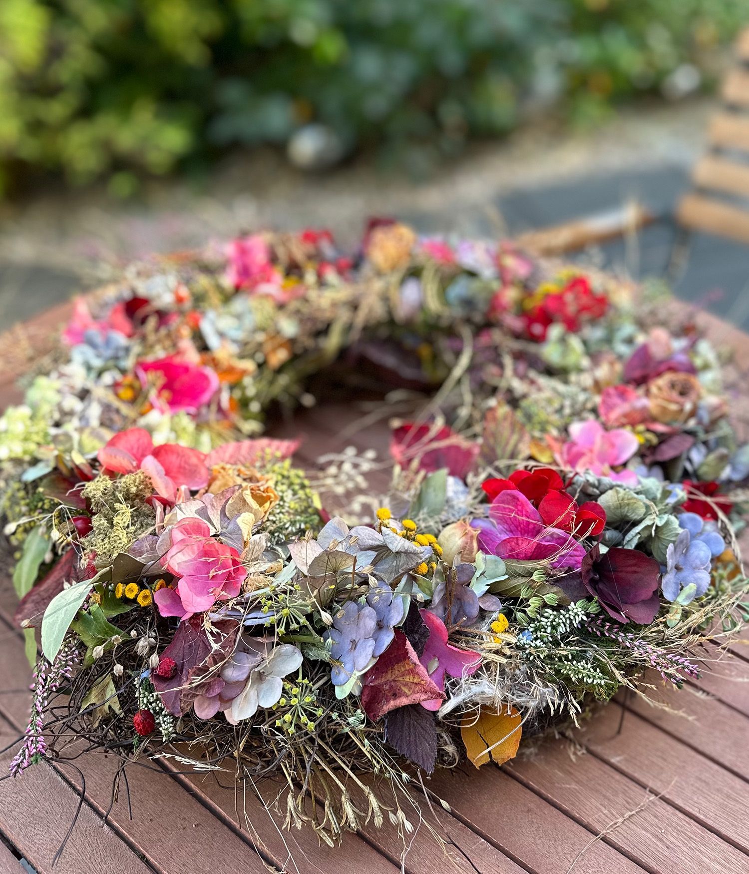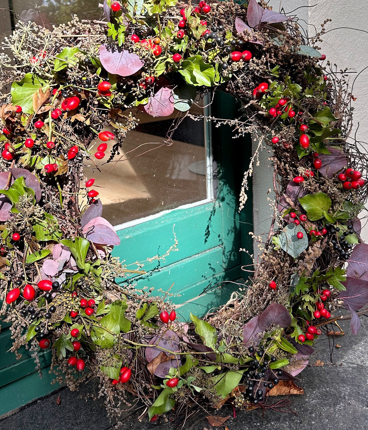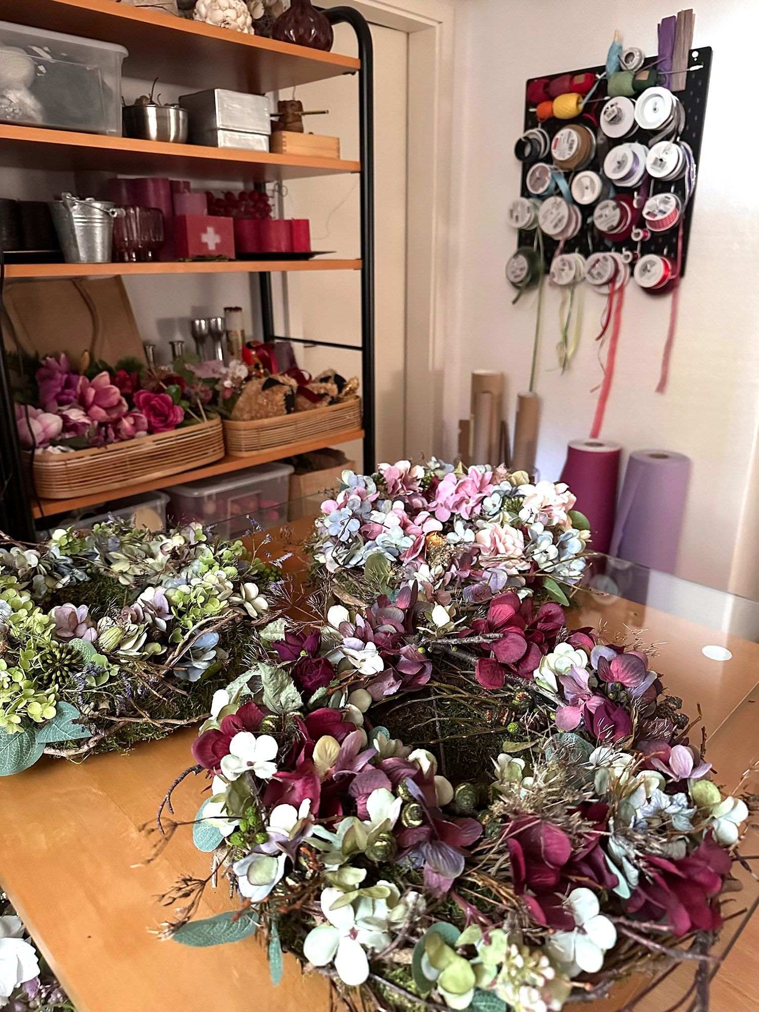 Hier werden frische Hortensien mit getrockneten Gräsern und Beeren kombiniert und mit Seidenblumen aufgefüllt, um lange Freude an den Kränzen zu haben.