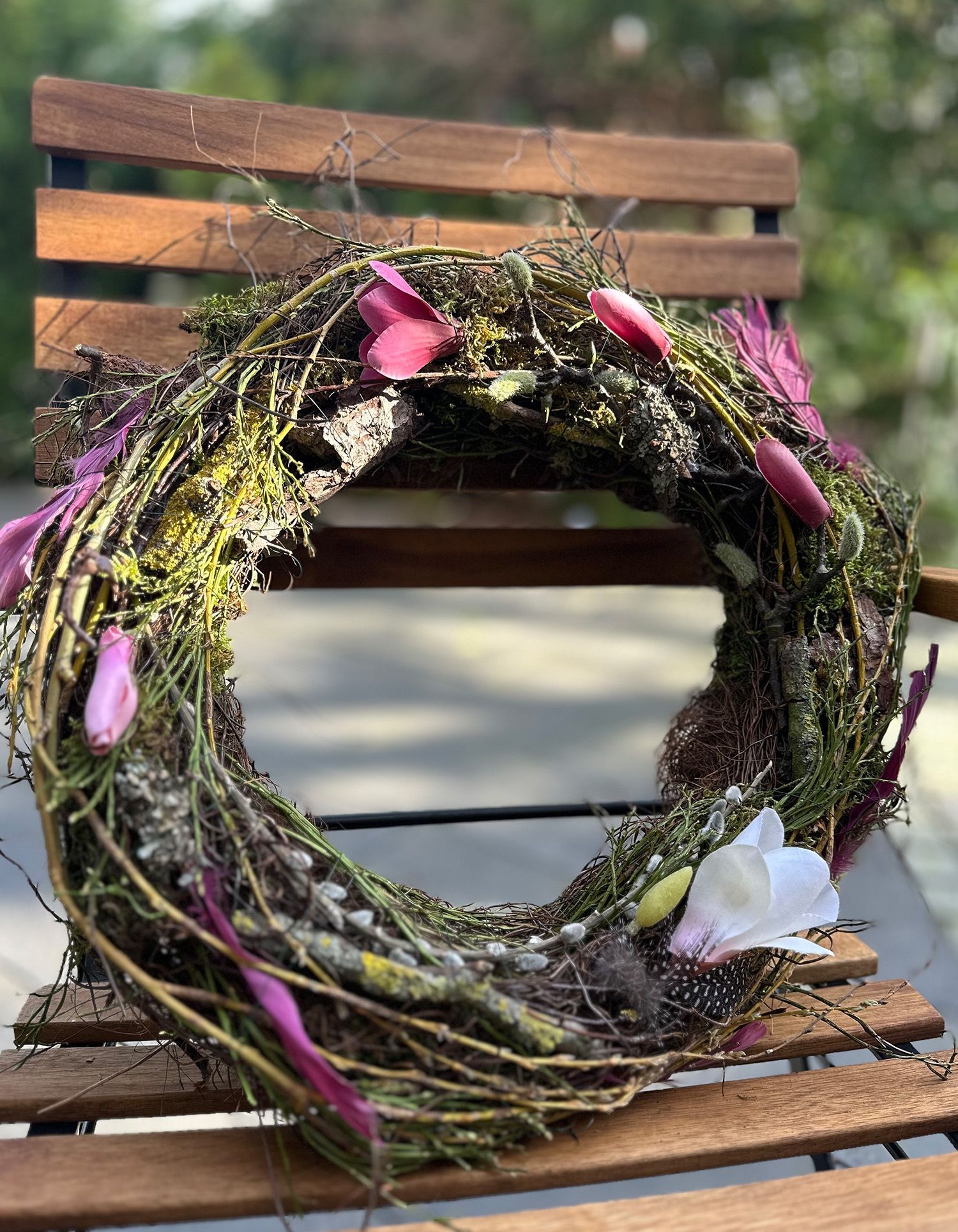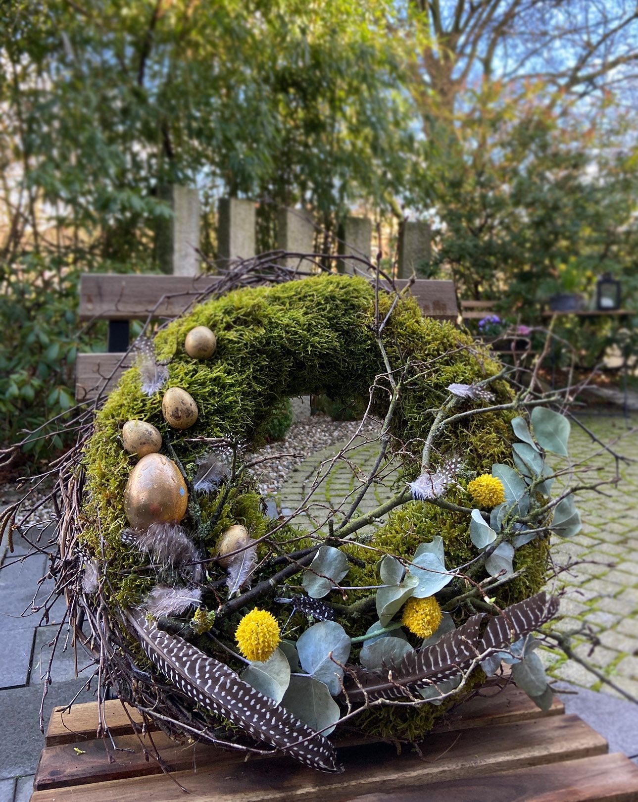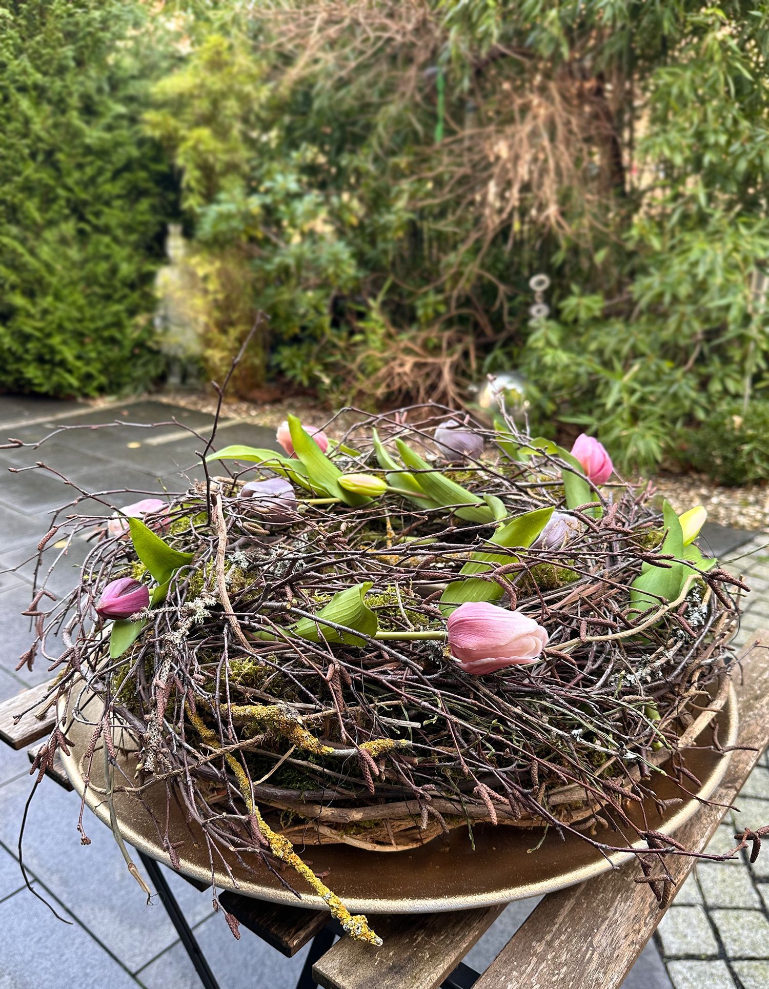 Aus Reisig, Bindegrün, Moos, Blütenzwiebeln und weiterem Naturmaterial lassen sich frühlingshafte bzw. österliche Kränze, Nester und Arrangements fertigen.