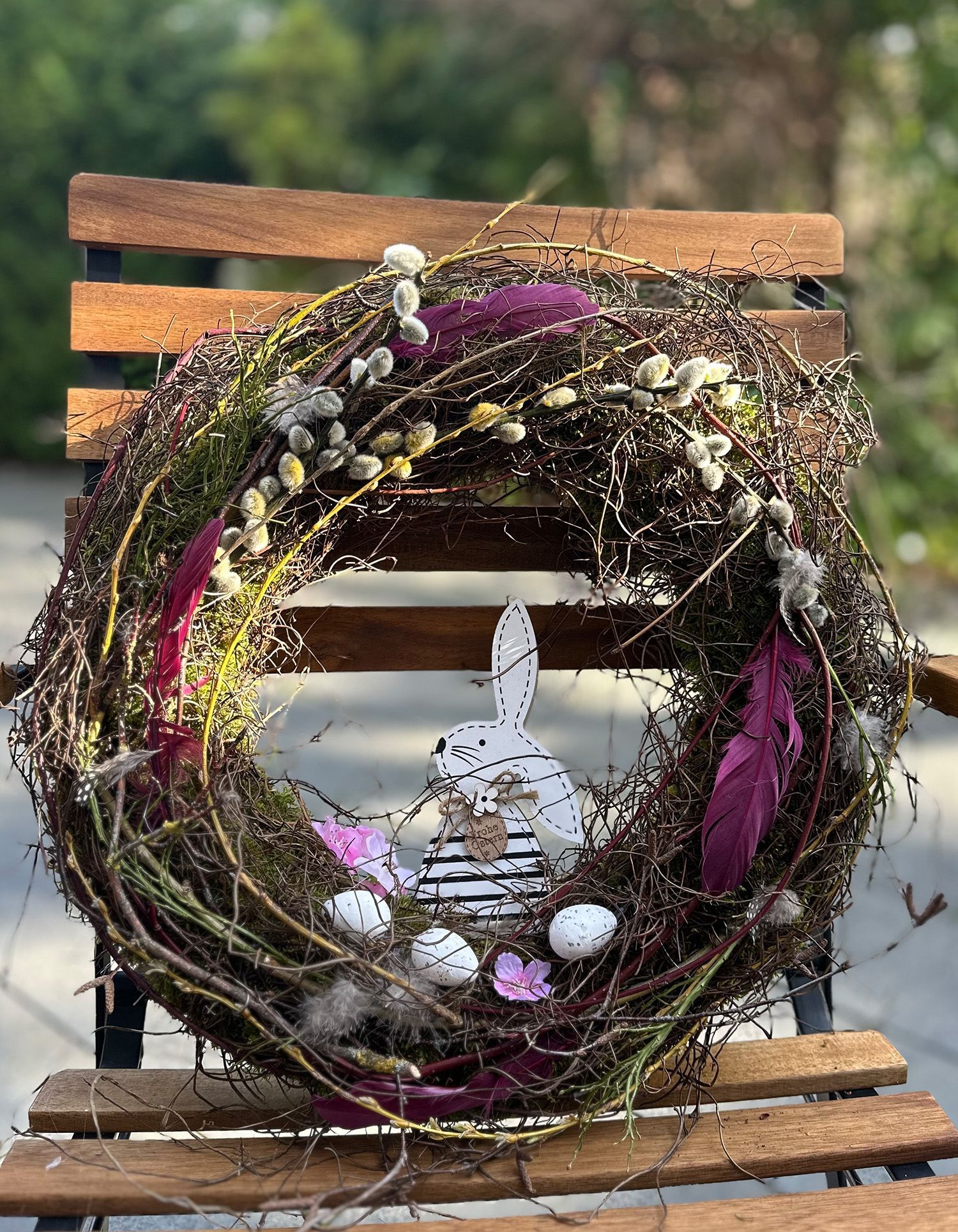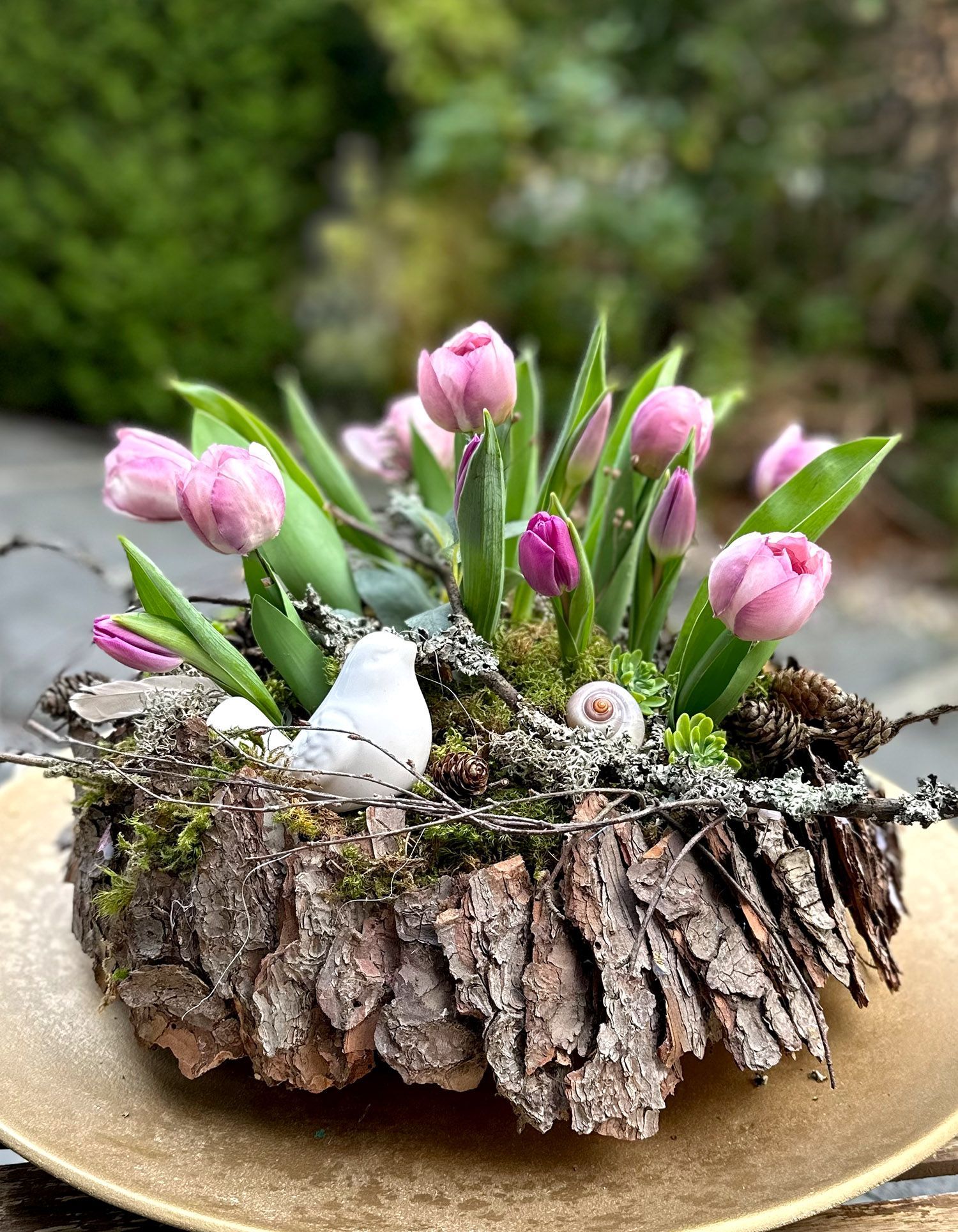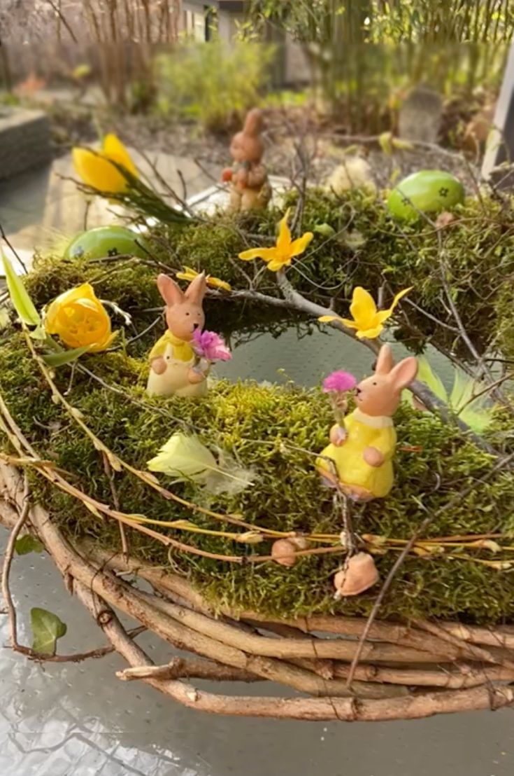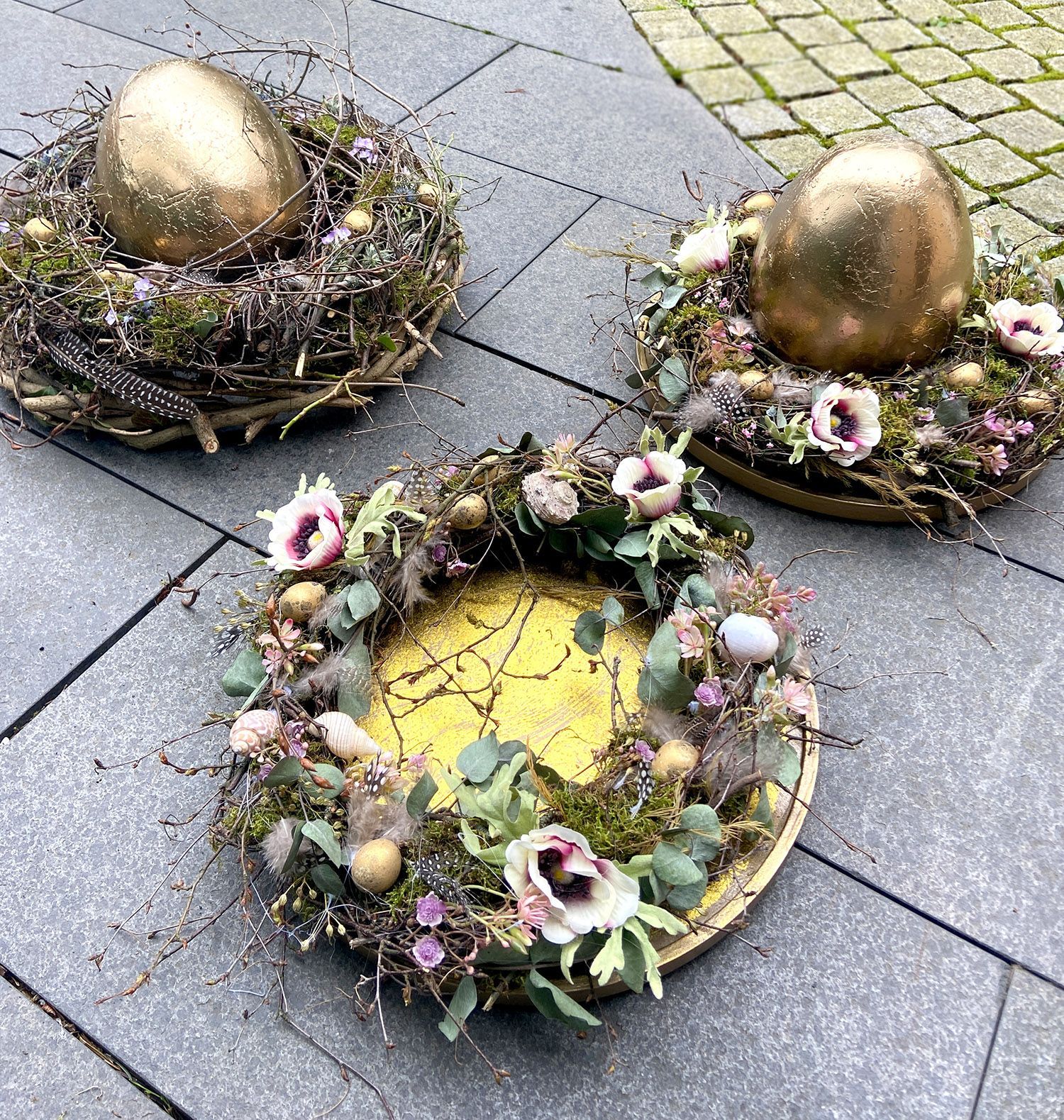 Aus Reisig, Bindegrün, Moos, Blütenzwiebeln und weiterem Naturmaterial lassen sich frühlingshafte bzw. österliche Kränze, Nester und Arrangements fertigen.