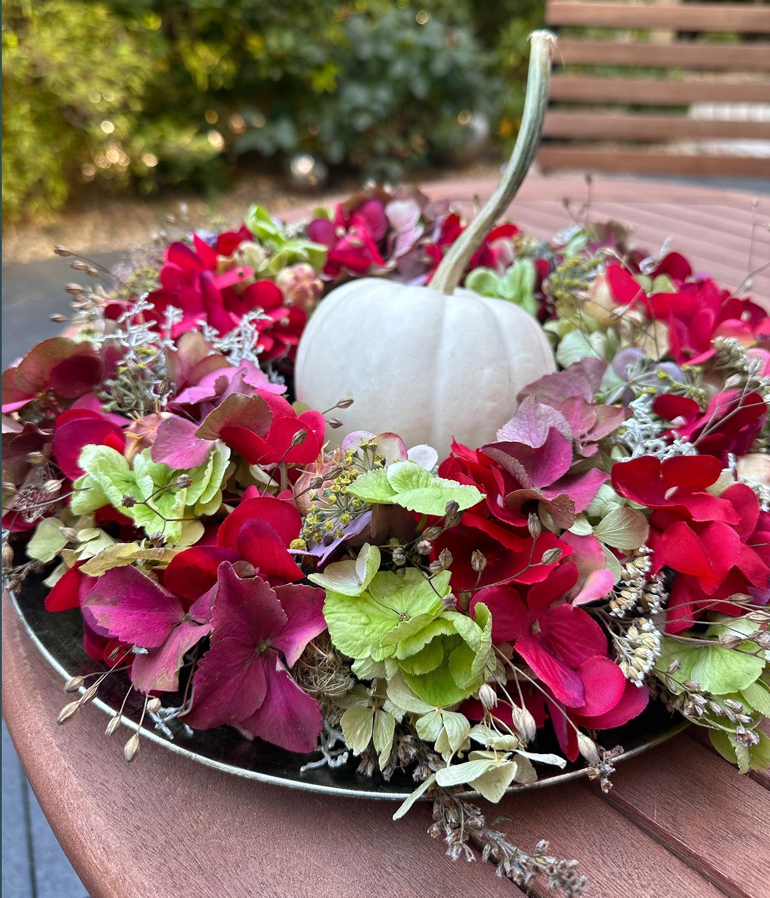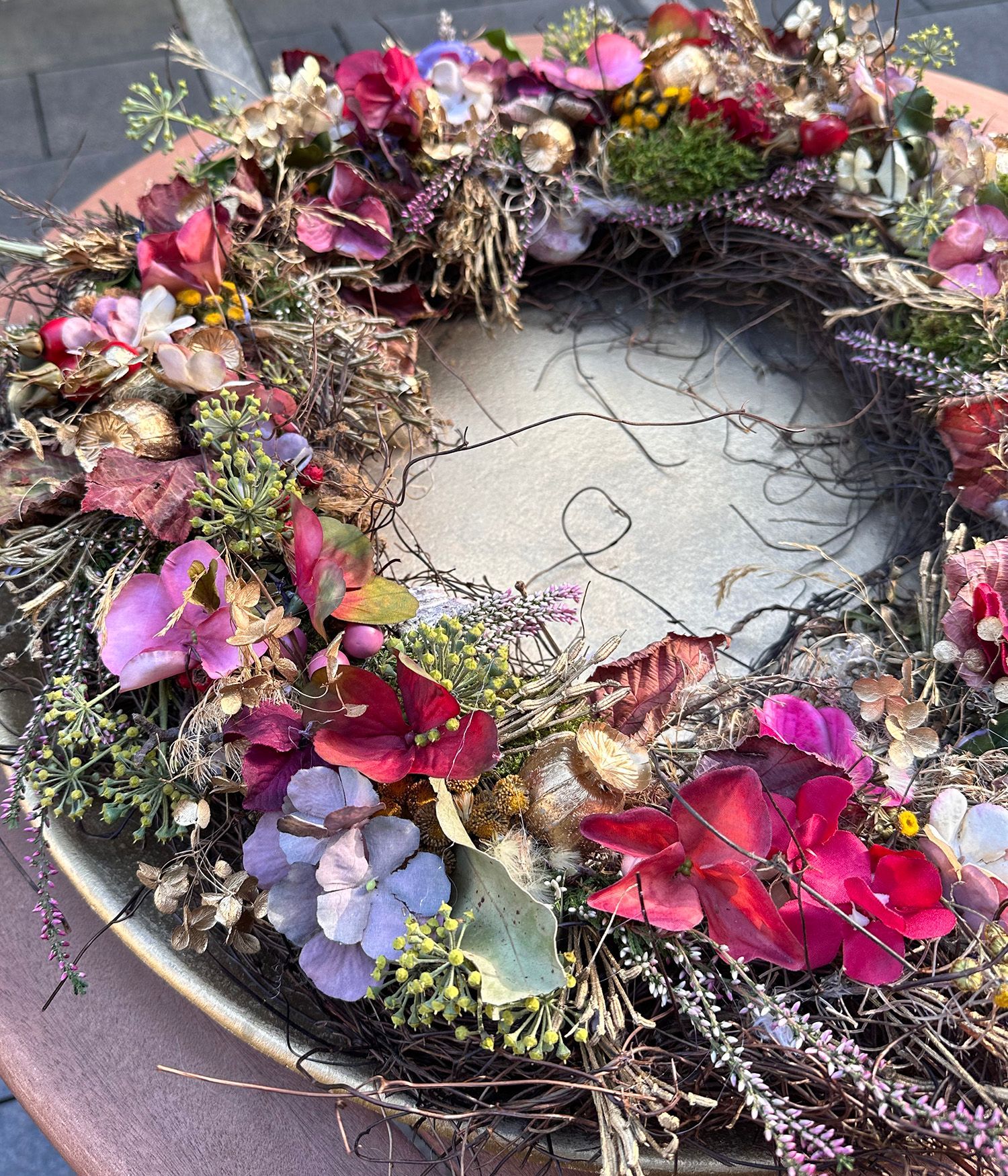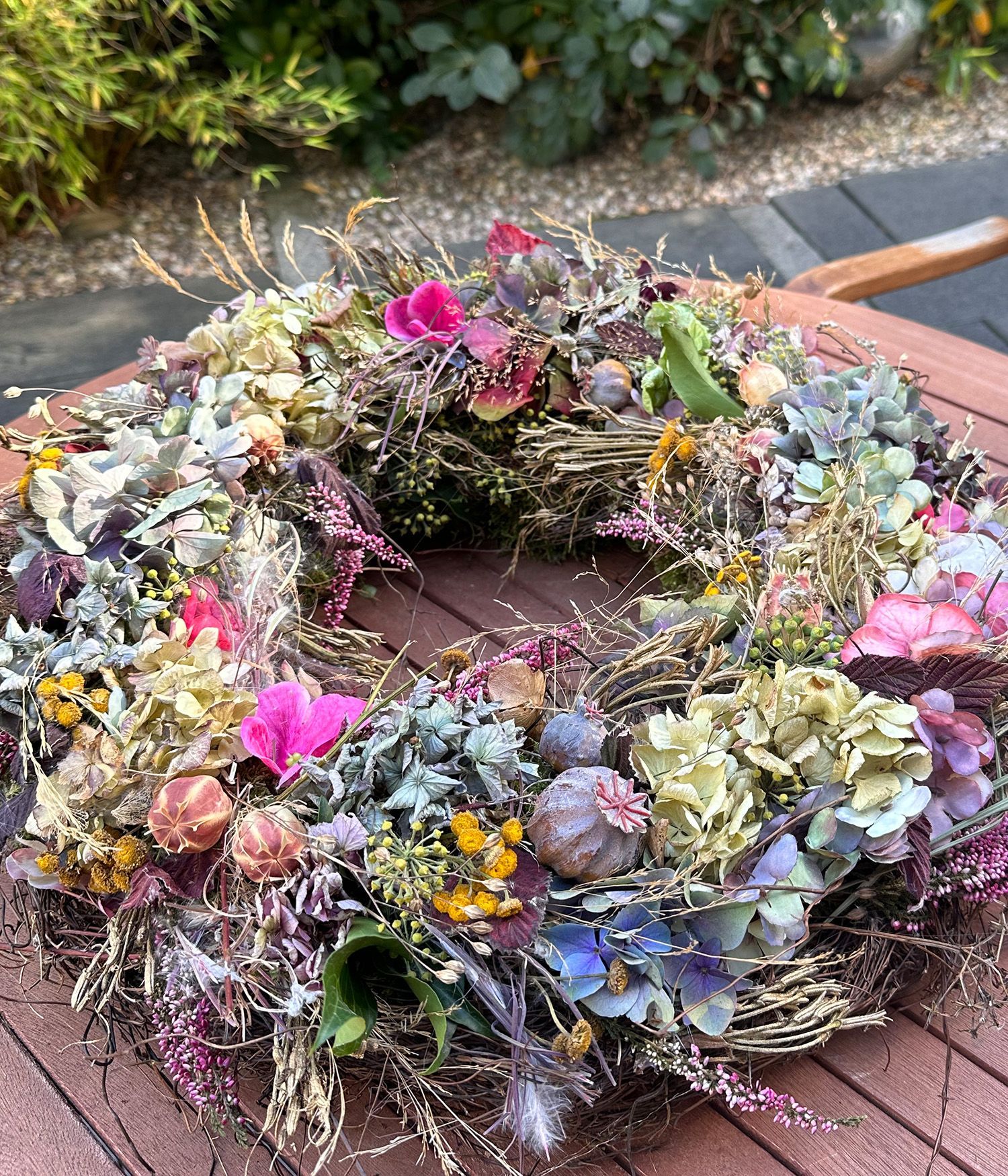 Hier werden frische Hortensien mit getrockneten Gräsern und Beeren kombiniert und mit Seidenblumen aufgefüllt, um lange Freude an den Kränzen zu haben.