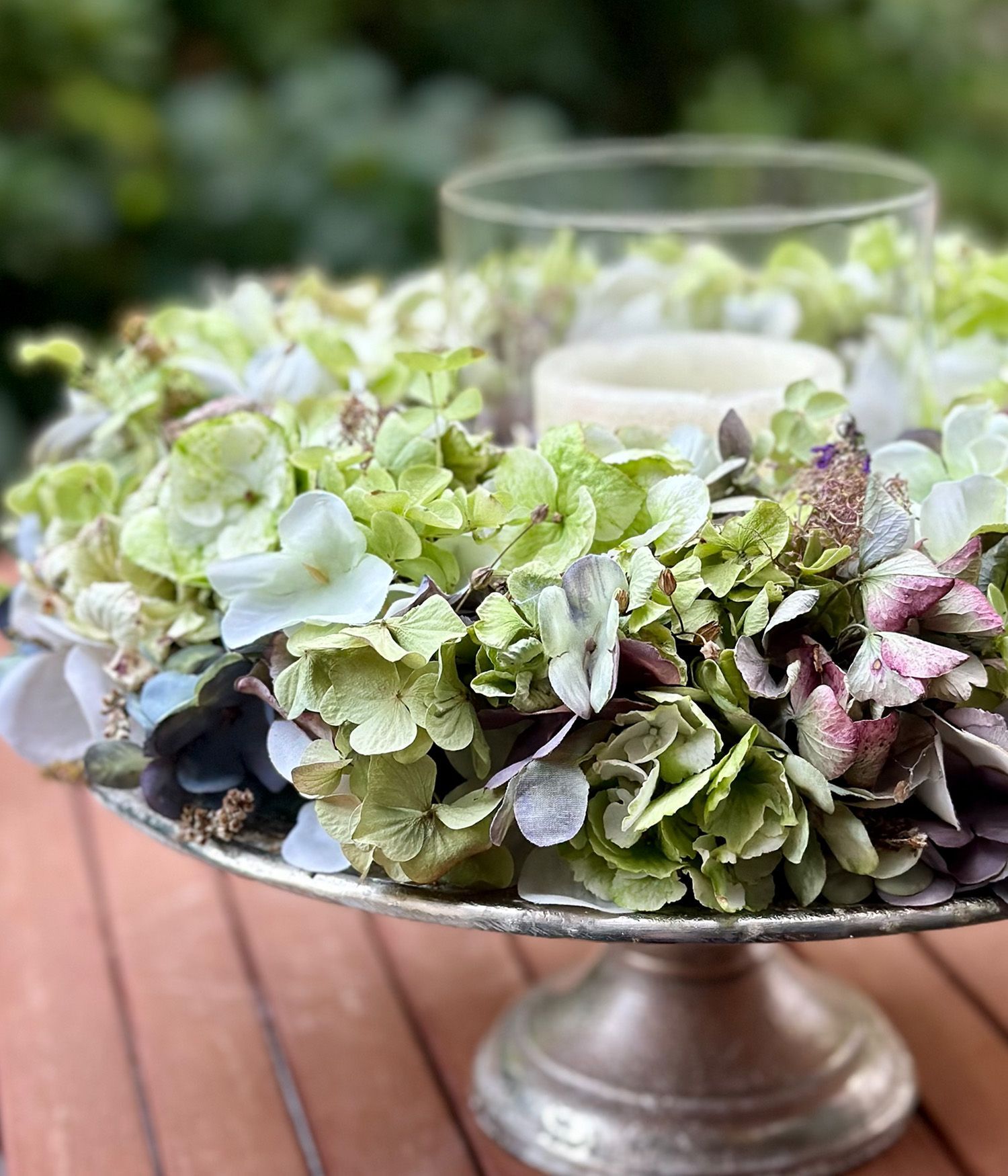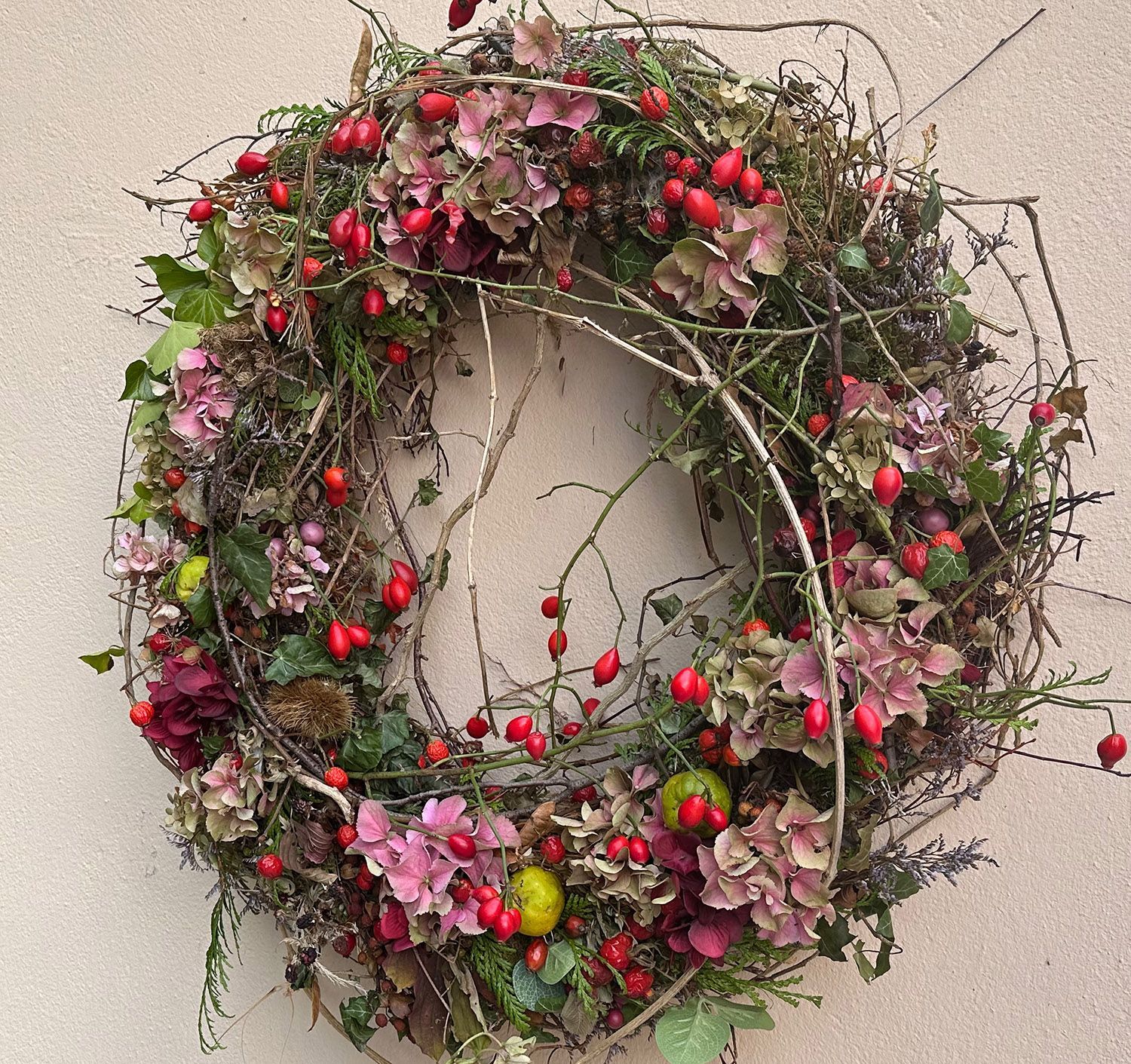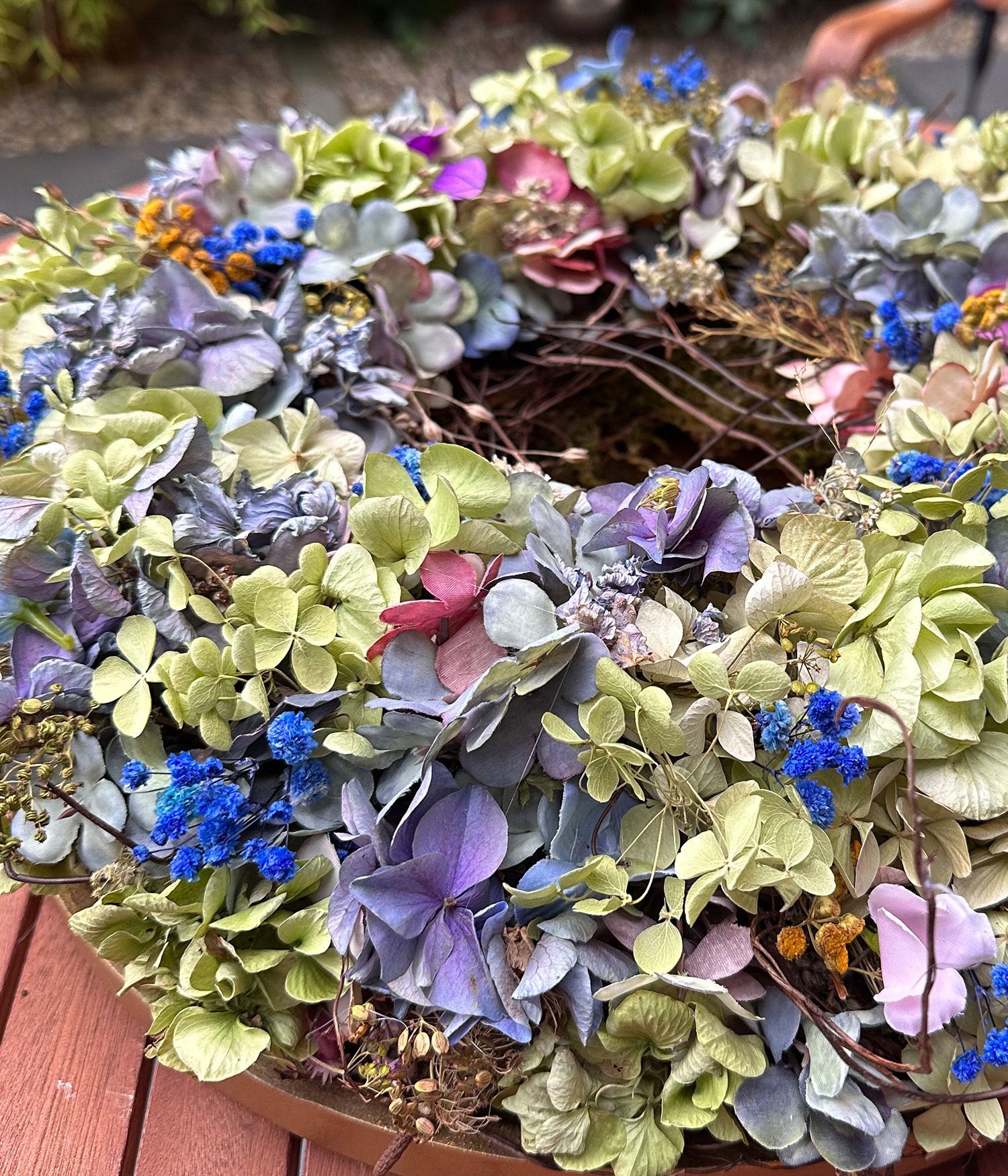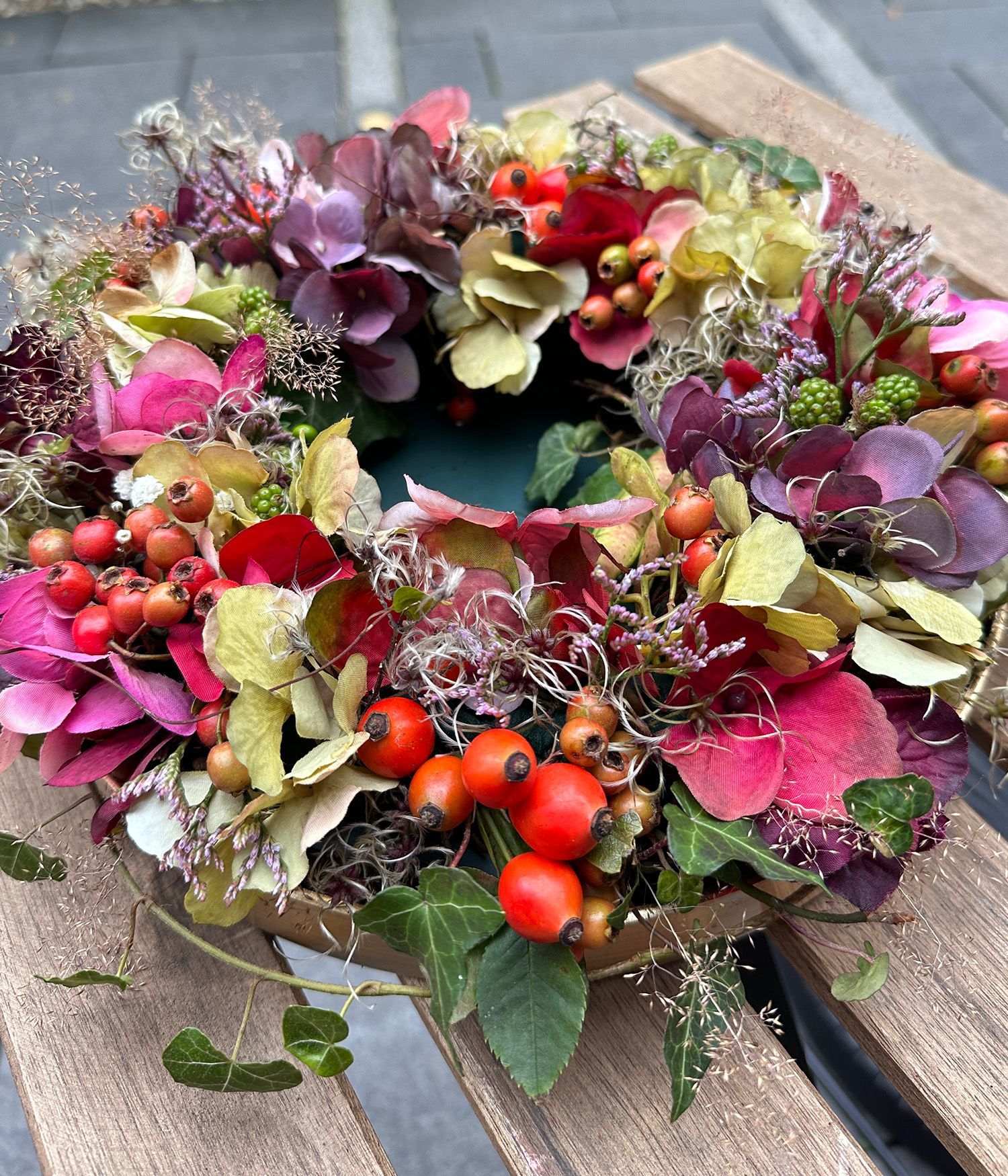 Hier werden frische Hortensien mit getrockneten Gräsern und Beeren kombiniert und mit Seidenblumen aufgefüllt, um lange Freude an den Kränzen zu haben.