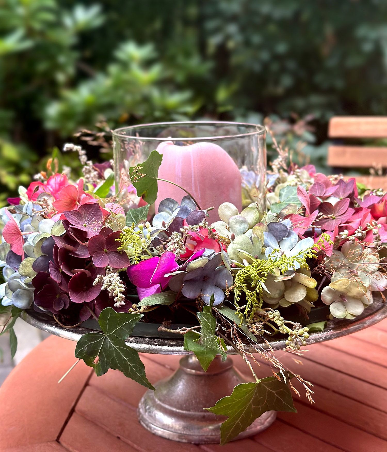 Seidenblumen bieten eine gute Grundlage für herbstliche Deko. Vor allem bei Kränzen oder Gestecken die von Dauer sein sollen, ist dies eine gute Alternative. Hortensien lassen sich toll arrangieren.